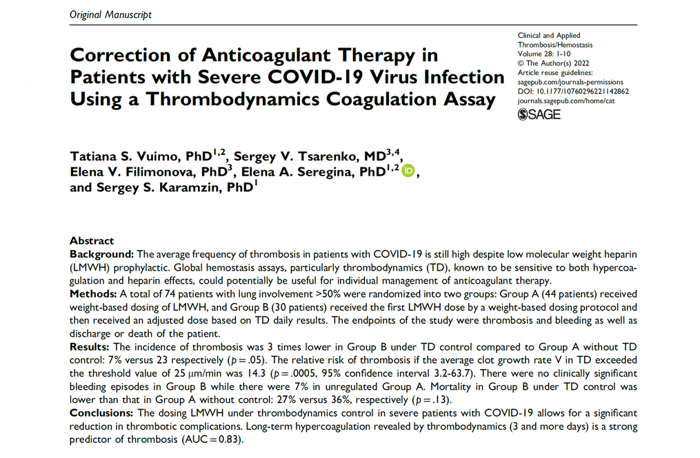 В середине ноября в журнале Clinical and Applied Thrombosis/Hemostasis были опубликованы результаты клинического исследования по применению тромбодинамики для контроля антикоагулянтной терапии.
